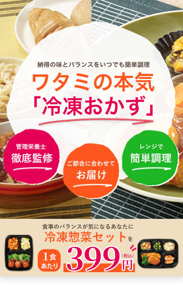 そんなときに出会った ワタミの宅食ダイレクト! バランスのとれた冷凍惣菜を 自宅に宅配便でお届けしてくれます 塩分やカロリーを気にしてる方におすすめな いつでも三菜 10食セットをお試し