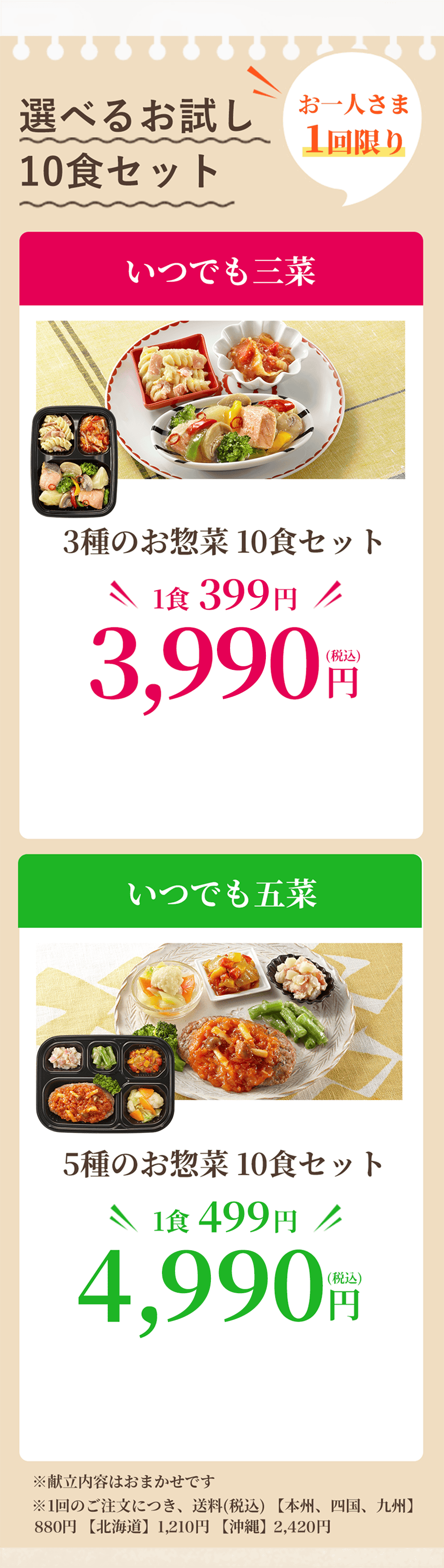 いつでも三菜 1食390円 3,900円(税込)