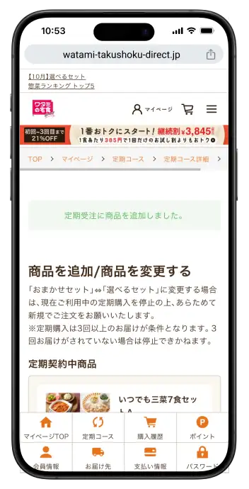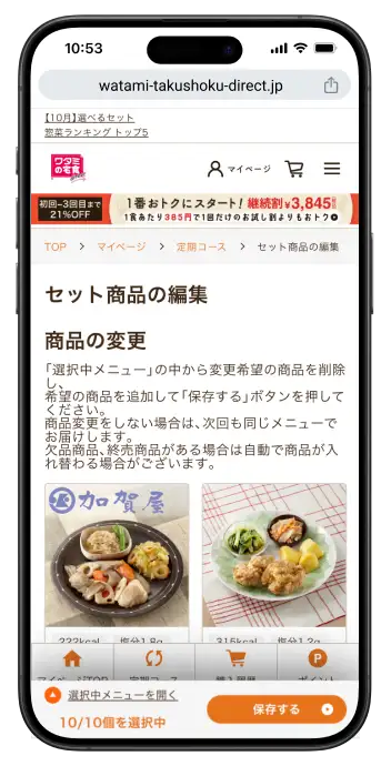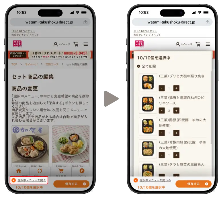 「選択中メニュー」の中から変更希望の商品を「-」で削除し、 希望の商品を「追加」して「保存する」を押してください。 商品変更をしない場合は、次回も同じメニューでお届けします。 欠品商品、終売商品がある場合は自動で商品が入れ替わる場合がございます。