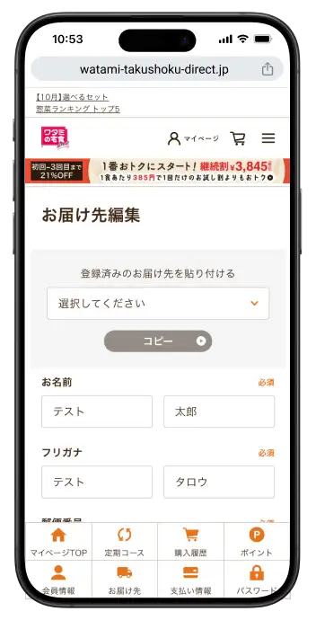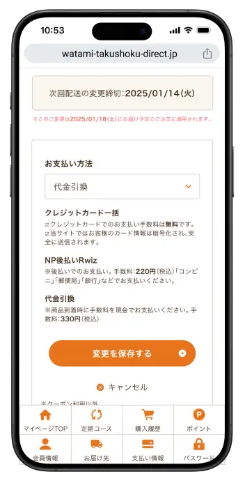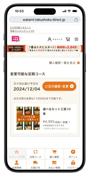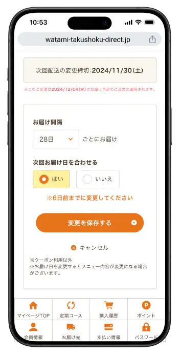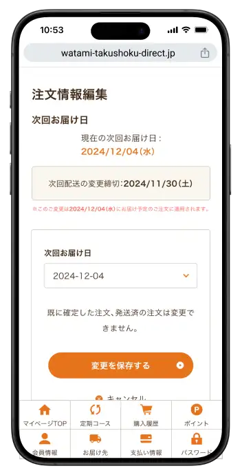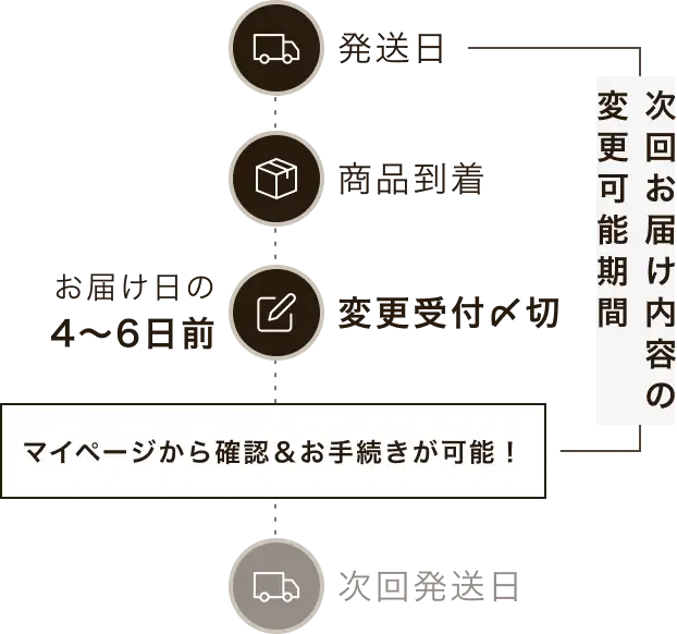 定期便の変更・停止をご希望の際は、お届け日の4〜6日前まで、マイページからお手続きが可能です。