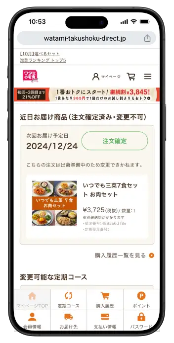 「近日お届け商品(注文確定済み・変更不可) 」に表示される注文は、直近でお届けする商品です。注文の変更はできません。商品の発送が完了すると、[購入履歴]に表示されます。