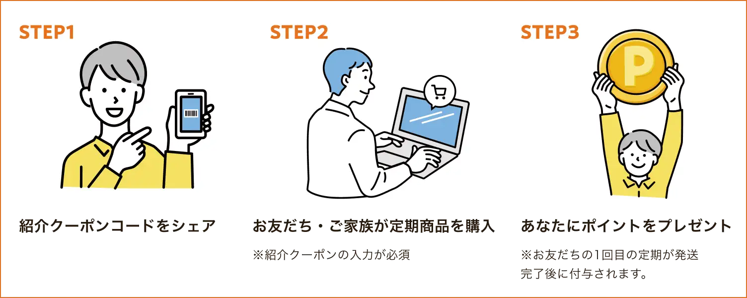 お友だちや離れて暮らすご家族、同僚やお知り合いに、下記の1,000円分割引クーポンコード(500円×2回分)をお渡しの上、定期購入をご紹介ください。紹介いただいた方がクーポンコードを使ってご購入されると、あなたには注文時に利用いただける3,000円分のポイントをプレゼントいたします!ご紹介は何名様でも可能です。1名様ご紹介毎に3,000ポイントをプレゼント。1,000円分のクーポンコードは定期購入にのみ使用でき、「継続割」と併用可能なので大変お得です!