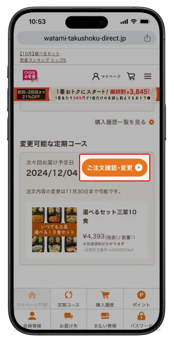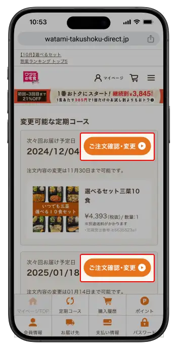 - 変更可能な定期コースの「ご注文確認・変更」をクリック