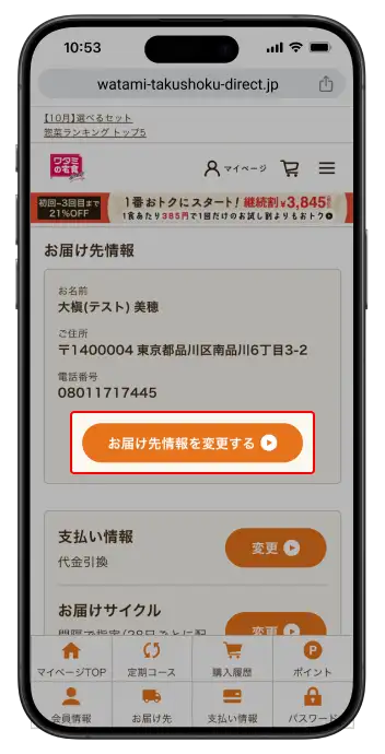 「定期コース詳細」ページ「お届け先情報」から「お届け先情報を変更する」を押してください。