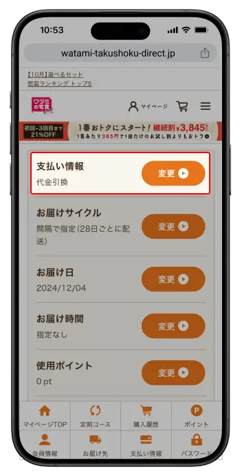 「定期コース詳細」ページ「お届け先情報」から支払い情報の横の【変更】を押してください。