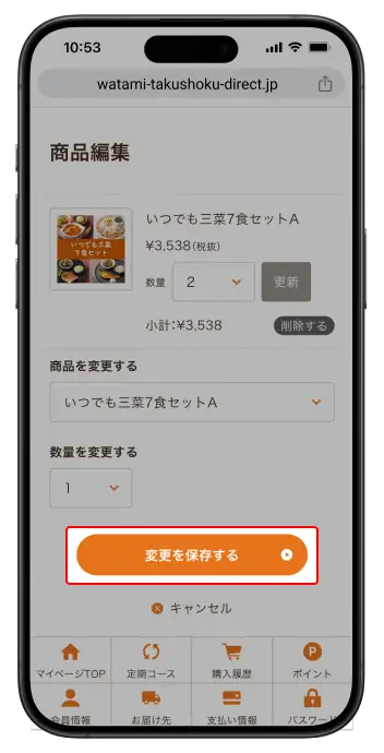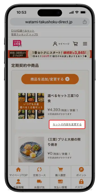 「定期コース詳細」ページ「定期契約中商品」の【セット内容を変更する】を押してください。