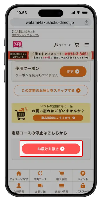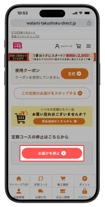 該当の選べるセットの「定期コース詳細」ページで【お届けを停止】を押してください。