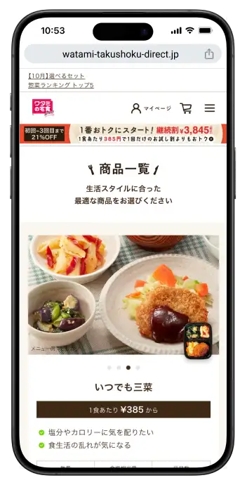 いつでも三菜といつでも五菜は、「継続割/お試し割」「おまかせセット」「選べるセット」「都度セット」のタブを押すと、それぞれのセットが閲覧できます。