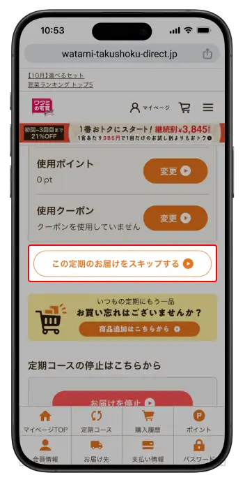 「定期コース詳細」ページで【この定期のお届けをスキップする】を押してください。