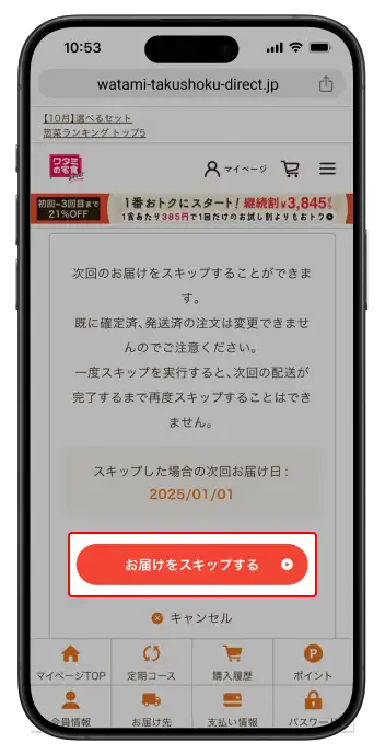 「注文情報編集画面」の[お届けスキップ]タブが表示されるので【お届けをスキップする】を押してください。