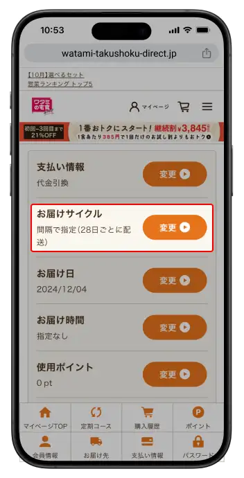ここから、お届け日の変更/スキップ/サイクル変更/停止 の操作が可能です。