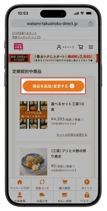「定期コース詳細」ページの[定期契約中商品]から【商品を追加/変更する】を押してください。