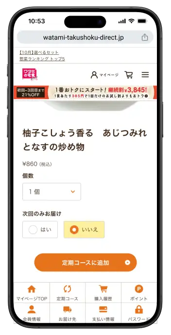 「商品の追加」が表示されるので、【数量】と、【次回のみお届けかどうか】を選択して、【定期コースに追加】を押してください。