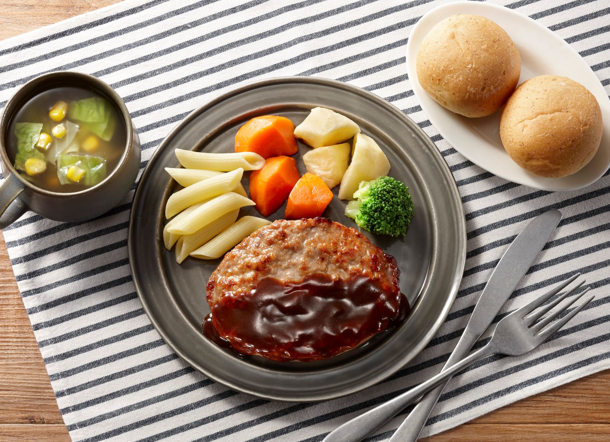 ハンバーグを2段階焼成でふっくらジューシーに焼き上げました。