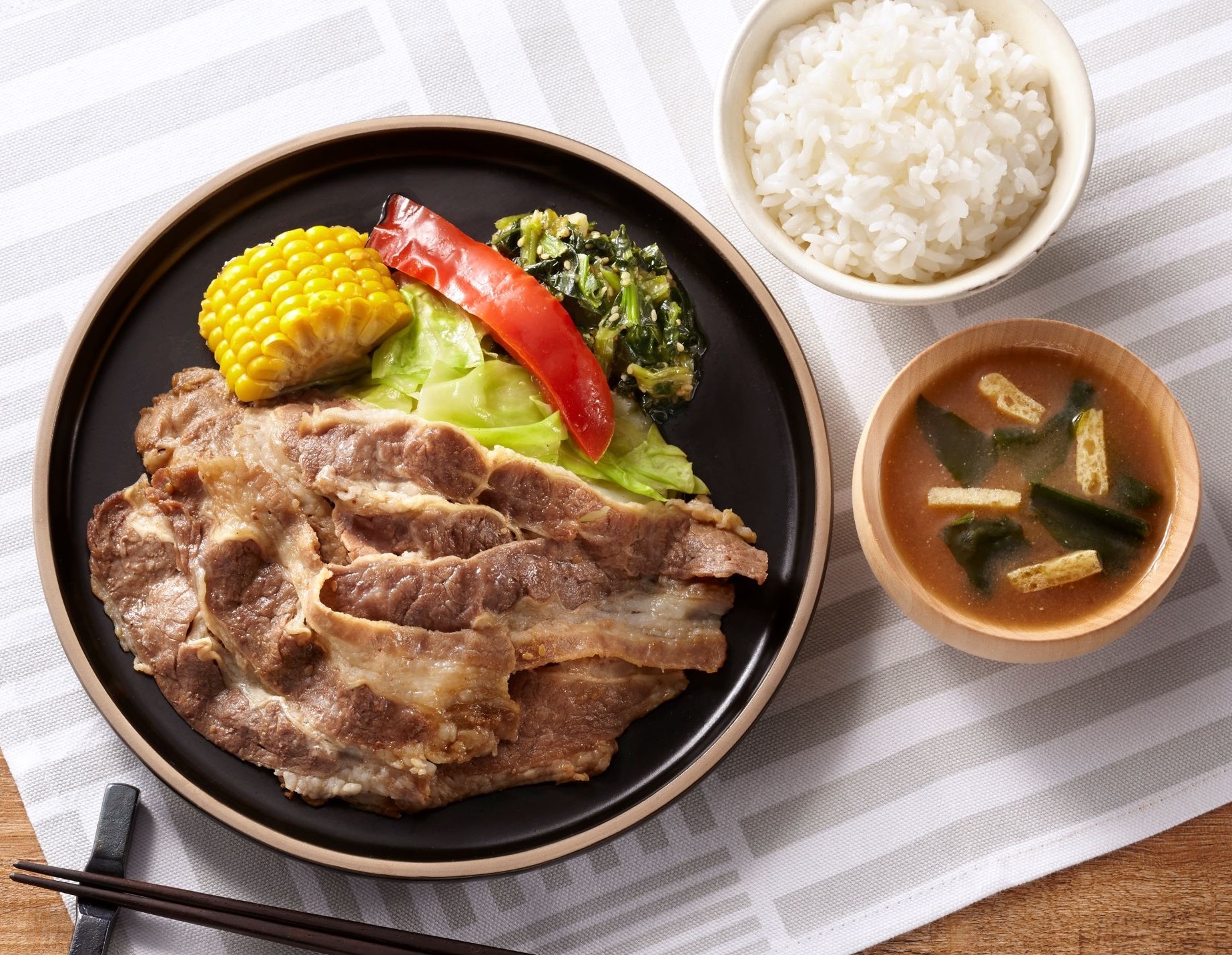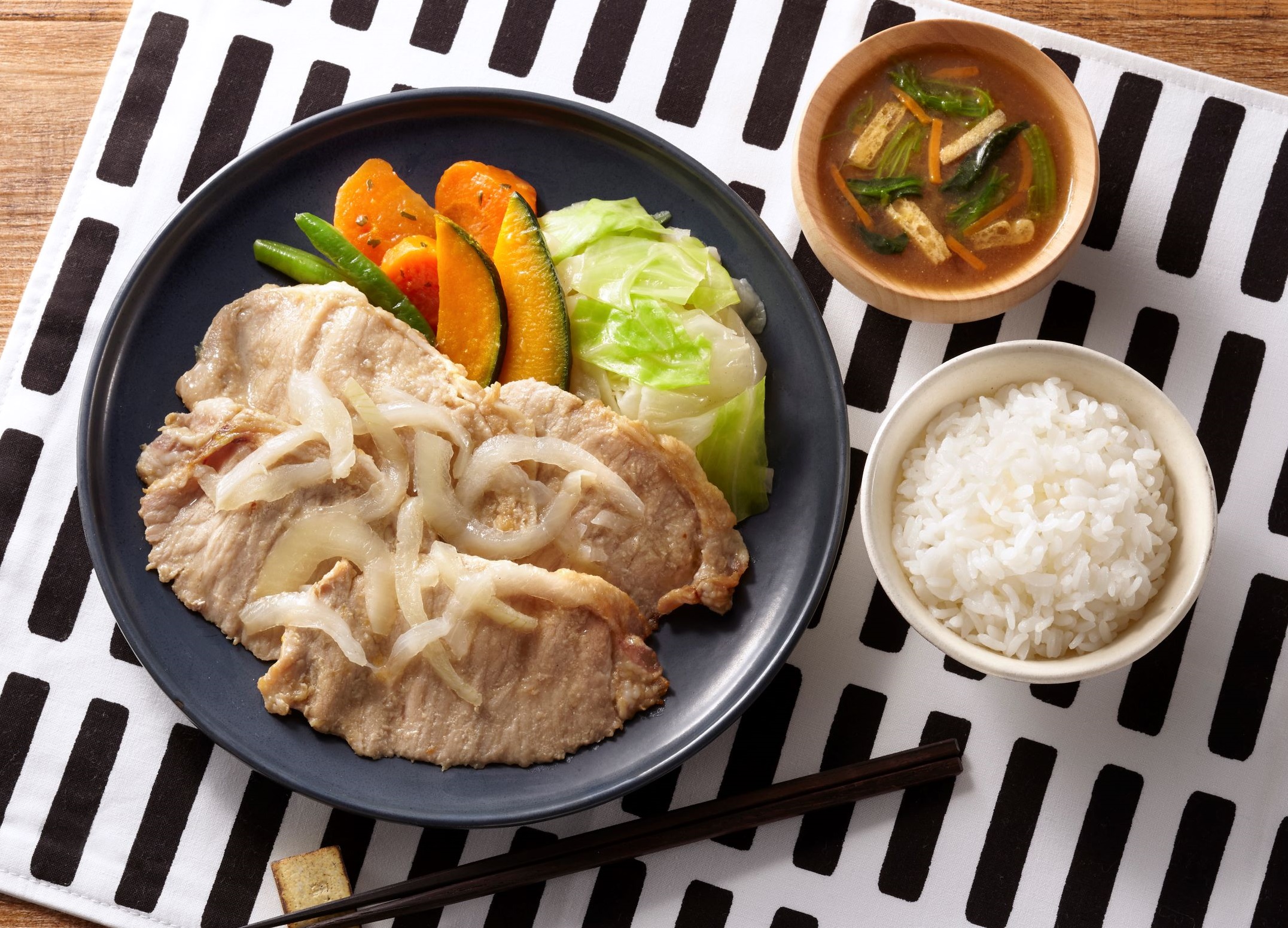 ふんわりジューシーに焼いた豚ロース肉と添えの彩り野菜を一緒に召し上がってください。