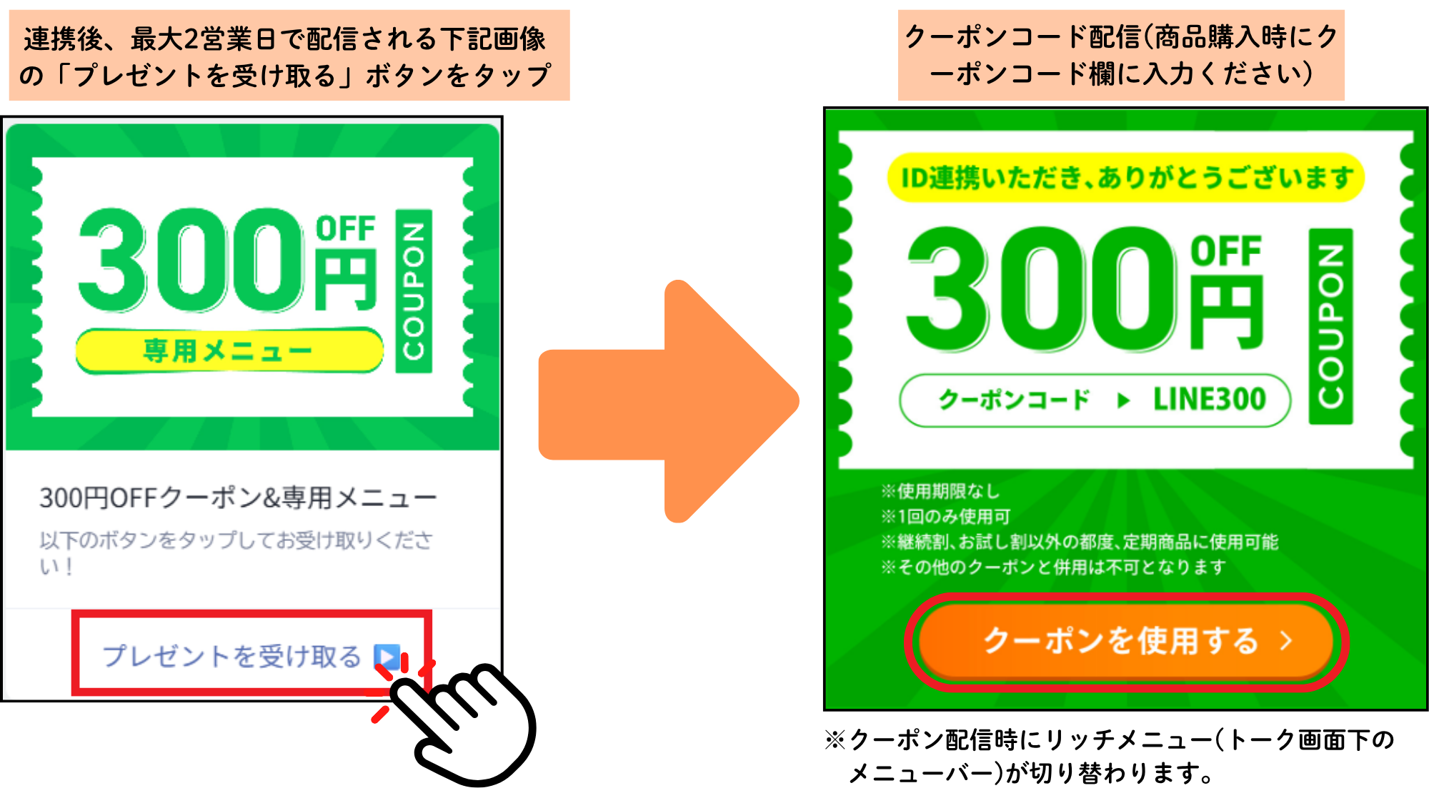 ※クーポン受取りのタイミングで、リッチメニューが切り替わります。新しいリッチメニューでは注文変更や同梱などの機能をご利用いただけます。