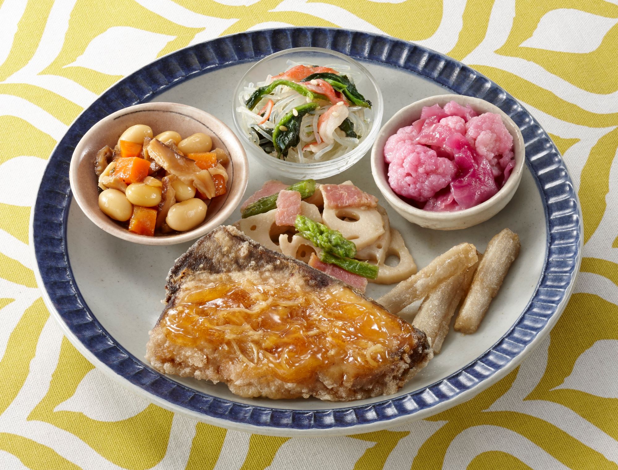 ふっくら揚げたブリに、たっぷり千切り生姜の入った特製あんをかけました。