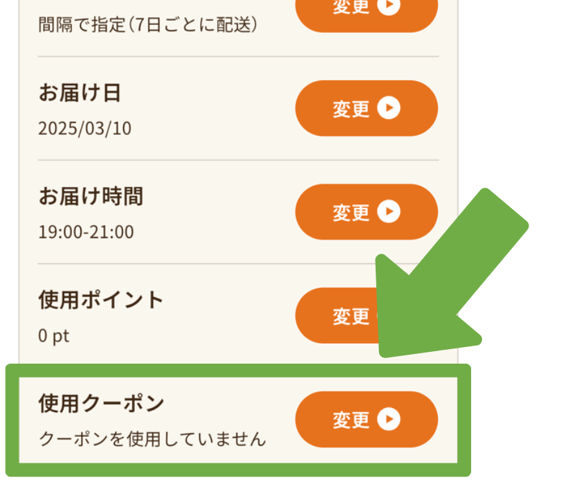 3. 定期詳細ページにある使用クーポン欄の「変更」をタップ(下図をご参照ください)