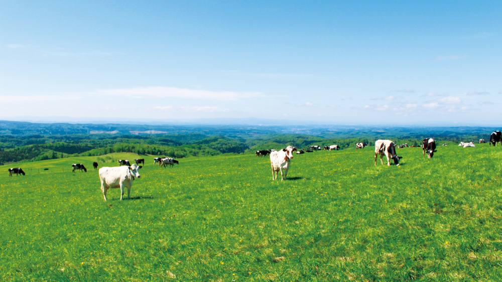 約300haと広大な土地で、農薬や化学肥料に頼らず、自然の力を活かした放牧中心のグラスフェッド飼育による酪農を行っています。