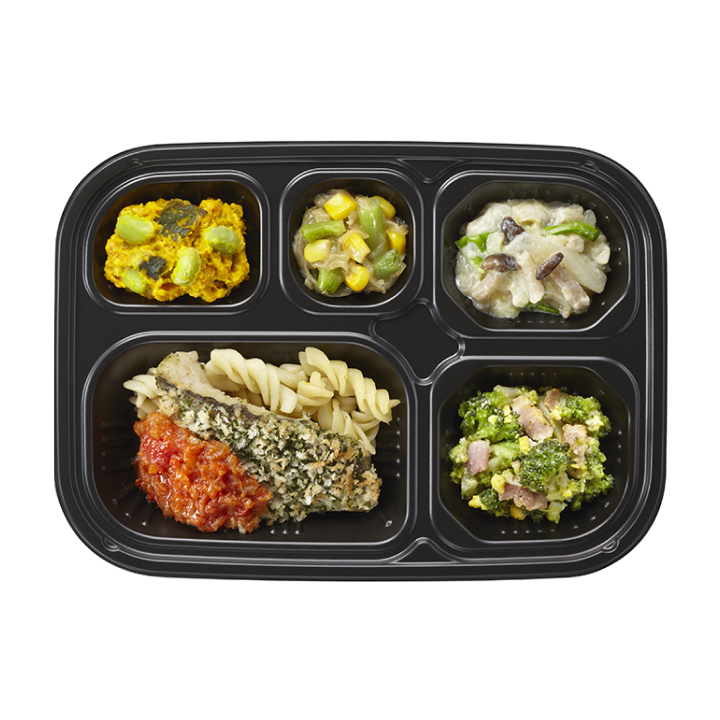 ※写真は1食分の献立例の盛り付けイメージです。お料理、惣菜容器以外のものは付属しておりません。/※品目数、熱量、食塩相当量は1食あたりの数値です。/※熱量、栄養素の補給につながる調味料の一部(油脂類、小麦粉などの粉類、砂糖、味噌など)は1品目として数えています。/※熱量の基準値は1セット平均で±50kcalの範囲としています。/※食塩相当量は1セット平均の計算値です。/※栄養成分値は献立作成時の計算値です。目安の数値としてお考えください。/※冷凍でお届けしますので、電子レンジで温めて召し上がってください。/※商品リニューアルに伴い、主菜名が同じでも、以前と内容が異なる場合がございます。/※魚に骨が入っている場合があります。骨にご注意ください。/※セット内容は、変更になる場合がございます。
