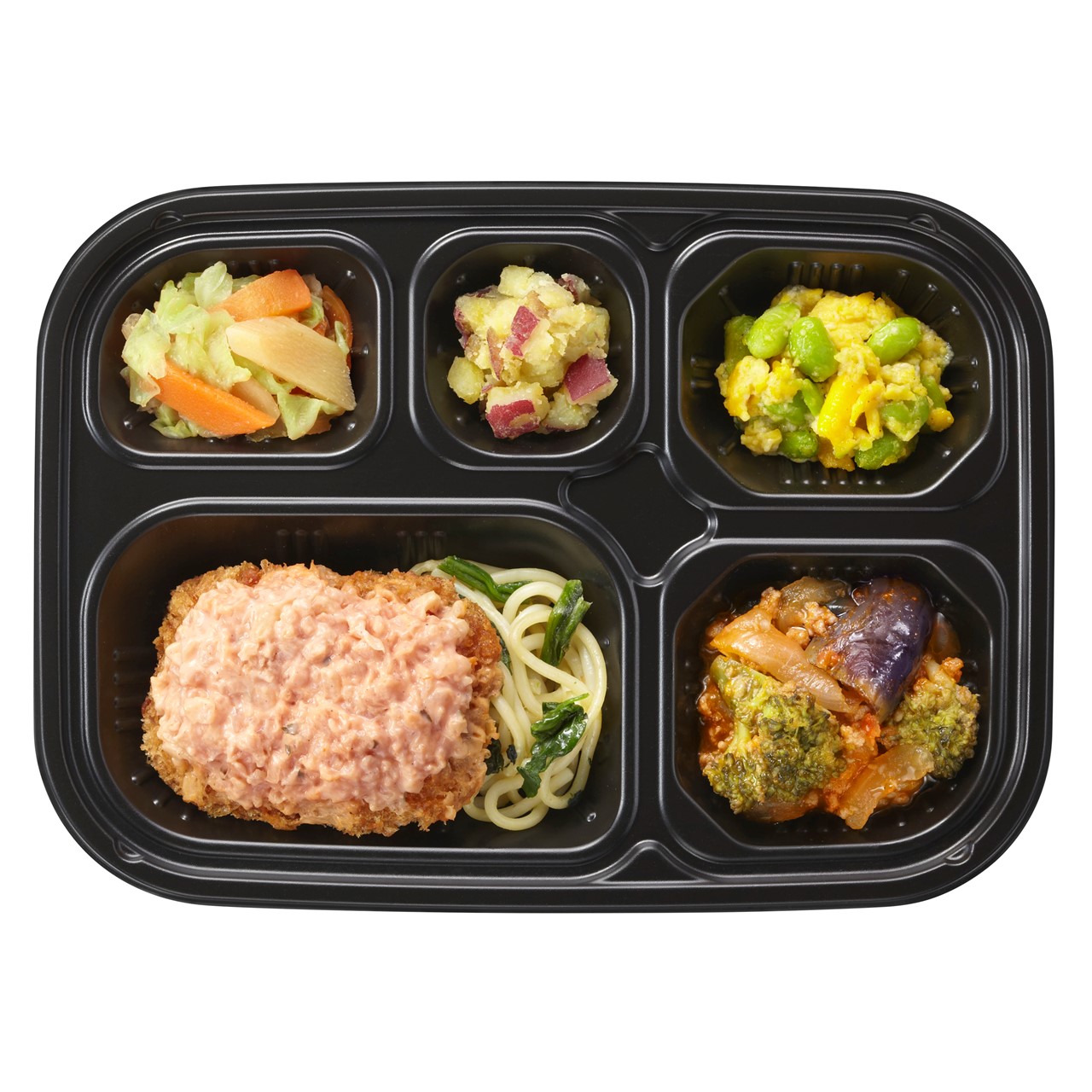 ※写真は1食分の献立例の盛り付けイメージです。お料理、惣菜容器以外のものは付属しておりません。/※品目数、熱量、食塩相当量は1食あたりの数値です。/※熱量、栄養素の補給につながる調味料の一部(油脂類、小麦粉などの粉類、砂糖、味噌など)は1品目として数えています。/※熱量の基準値は1セット平均で±50kcalの範囲としています。/※食塩相当量は1セット平均の計算値です。/※栄養成分値は献立作成時の計算値です。目安の数値としてお考えください。/※冷凍でお届けしますので、電子レンジで温めて召し上がってください。/※商品リニューアルに伴い、主菜名が同じでも、以前と内容が異なる場合がございます。/※魚に骨が入っている場合があります。骨にご注意ください。/※セット内容は、変更になる場合がございます。