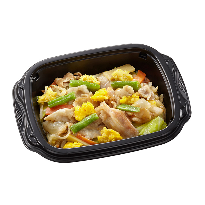 柔らかく甘みの強い銚子産山口さんのキャベツを使用した野菜炒めです。6種類の野菜と肉をラードで炒めて、にんにくとオイスターソースのコクで仕上げました。不足しがちな野菜をたっぷり180g使用し、1日分の野菜の半量が摂れる一品です。